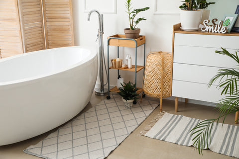 e) Bathroom: Include runner rugs in your large bathroom in front of the bathtub, shower space, or bathroom vanity to provide grip and protection on the floor next to wet areas. They also add warmth and a cohesive look to your bathroom.
